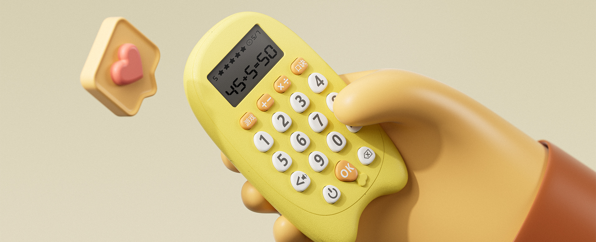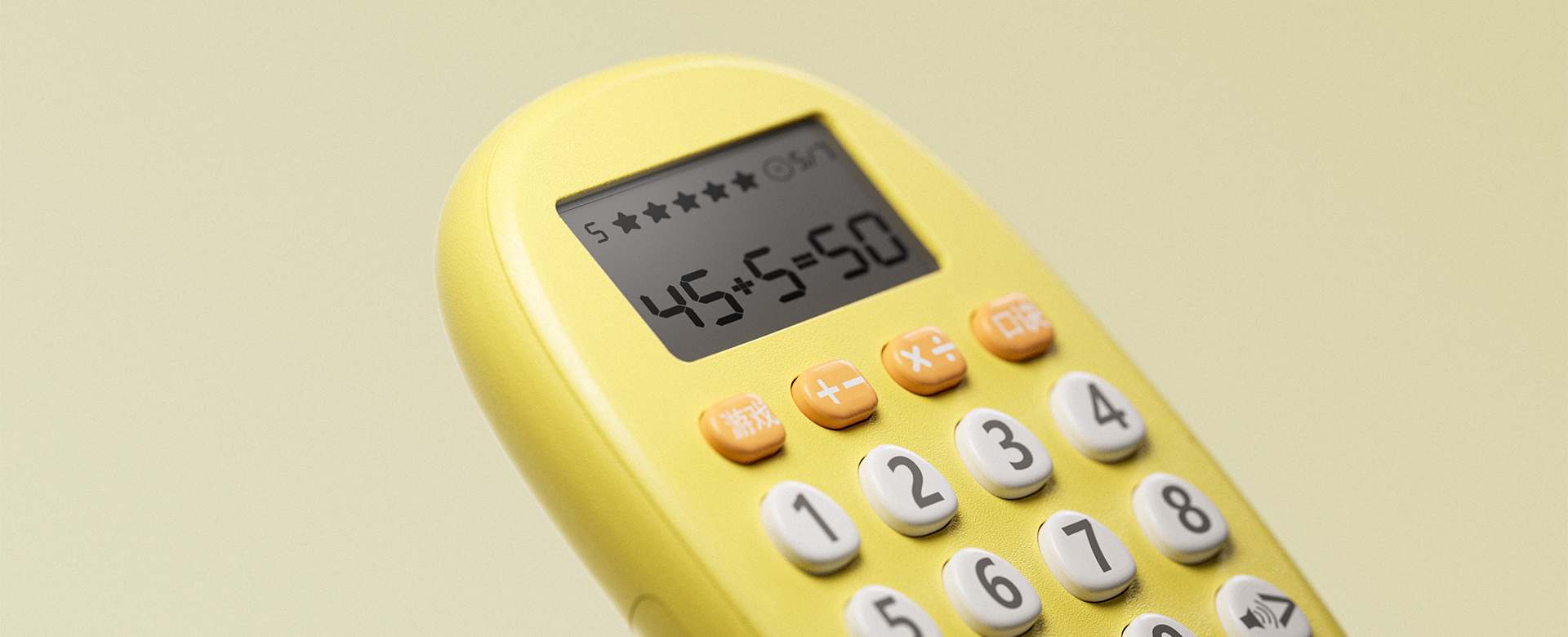 这款口算宝是艺格公司携手科大讯飞设计的产品,从工业产品外观设计的角度来看,椭圆的外形加上圆润的脚,使计算器具有友好和平易近人的外观,适合其预期的儿童受众。明亮的黄色配色,加上橙色和白色的按键,使计算器在视觉上对儿童有吸引力。